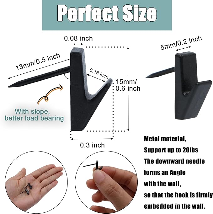 - PRACTICAL DESIGN - Our thumbtack hooks can save space by hanging some lightweight items, while is convenient for picking and placing them. In addition, compared to other nails that are nailing into the wall vertically, our tack hooks have a proper angle to ensure that it will be firmer when nailing into the wall.