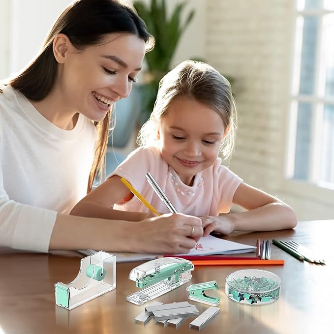 Office Supplies Set Desk Accessory Kit, Acrylic Stapler Set Staple Remover, Tape Dispenser, Binder Clips, Paper Clips, Ballpoint Pen and Scissor with 1000 Pieces 26/6 Staples (Green)