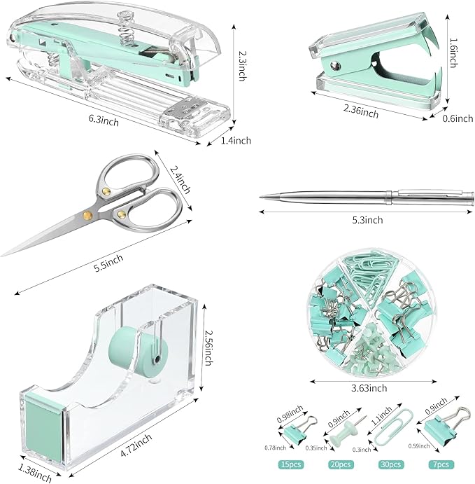 - Thoughtful design: there is a non-slip mat on the bottom of the stapler; The stapler is about 6.2 x 2.3 x 2.3 inch, tape dispenser is about 4.7 x 2.7 x 1.2 inch, the staple remover is about 2.3 x 1.6 x 0.4 inch, the scissor is about 5.5 x 2.4 inch, the pen is about 5.3 inch; They can be put in the drawer at will, will not take up space; The clip is equipped with a lattice storage box for easy storage; You can put them in your handbag or schoolbag and take them with you anywhere