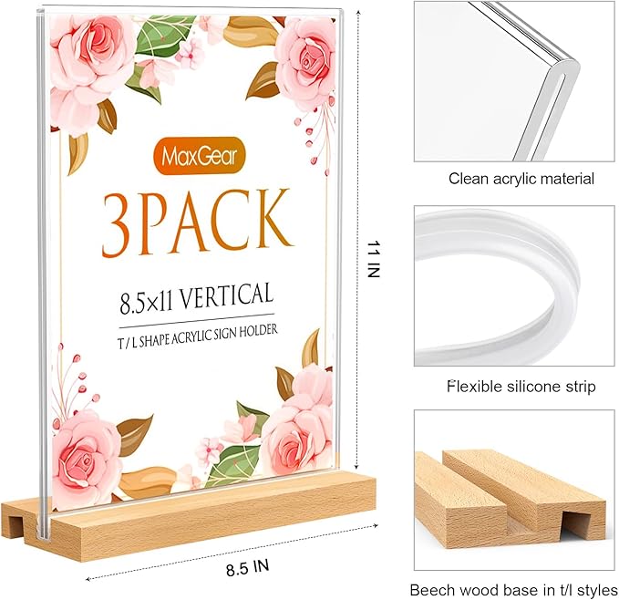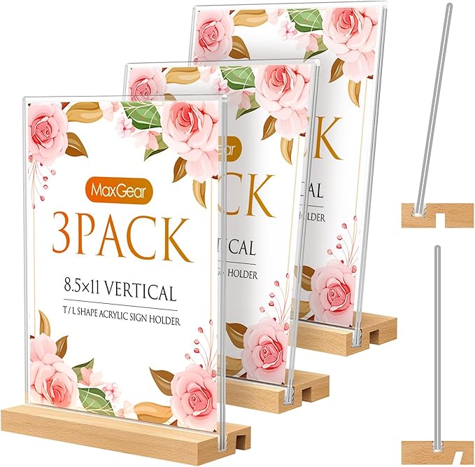 MaxGear L/T Shape Acrylic Sign Holder, 8.5 X 11 Clear Table Display Stand with Wooden Base, Flyer Menu Holder Photo Frames Paper Stand for Office, Wedding, Restaurants, Hotels 3 Pack