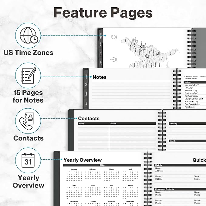 - COMPLETE TIME MANAGEMENT: quick-access to reinforced laminated monthly tabs, durable poly movable bookmark for quick navigation, yearly overview & important dates section for efficient daily planning.