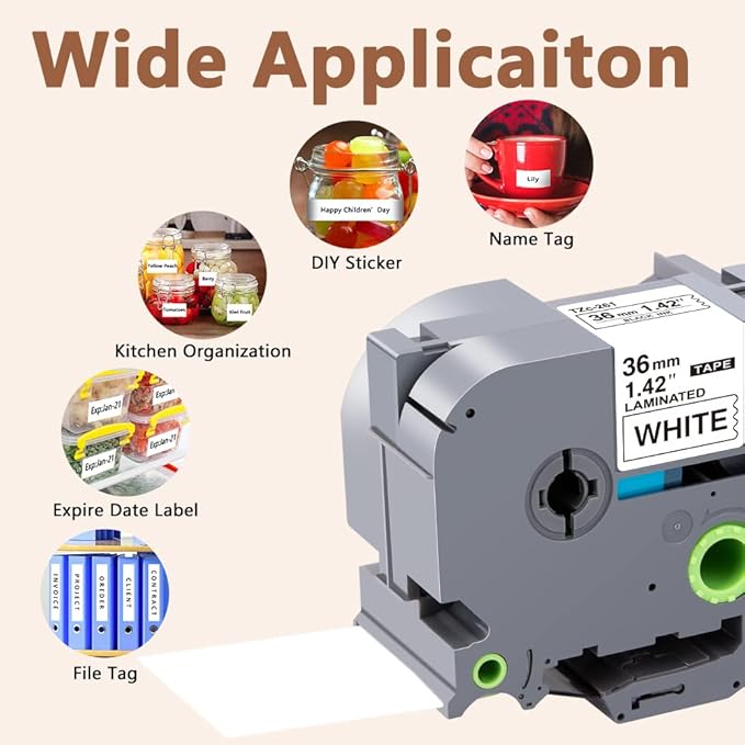 - Wide application: Compatible for Brother P-touch TZe 261 label tape is ideal to print clear, good-looking and durable labels. These labels are great for shelving, kitchen use, cabinets, file folders, USB sticks, food containers, storage boxes, personal possessions, children's school equipment with it's superior adhesive