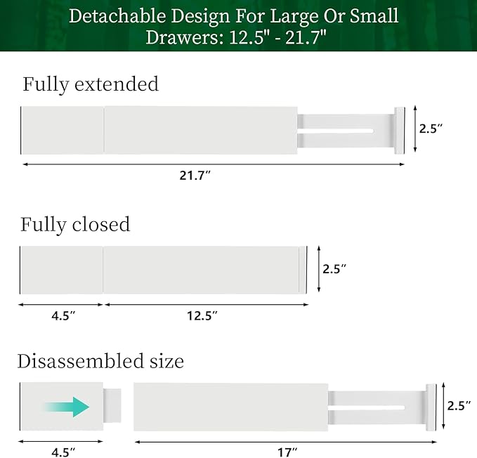 - EXPANDABLE FROM 12.5’’ TO 21.7’’ AND ADJUSTABLE BAMBOO DRAWER DIVIDER. You may need to purchase 12"-17" and 17’’-25’’ drawer divider to fit your various drawers. But with creative detachable extendable inserts, these bamboo drawer dividers expand from 12.5 inches to 21.7 inches in full length, which can fit different sizes of drawers. Tool-Free installation will fit most drawers up to 21.3 inches deep