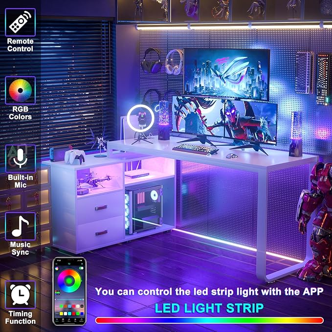 Homieasy L Shaped Desk with File Cabinet & Power Outlet, Reversible 55 Inch Large Corner Computer Desks with LED Strip, L-Shaped Desk with Drawers and Storage Shelves for Home Office, White