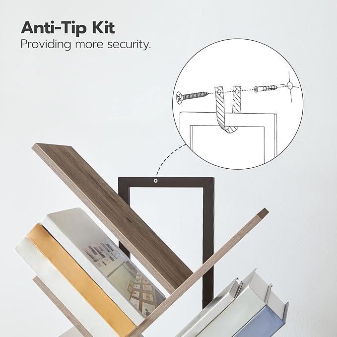 - Stable Structure: The tree bookshelf is made from high-quality particle board and metal frame, which is stable and durable. Equipped with the anti-toppling device, no matter where the book tree bookshelf sits, it can stand safely without worrying about tipping over