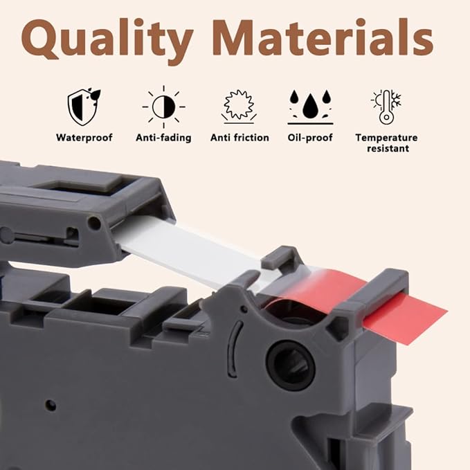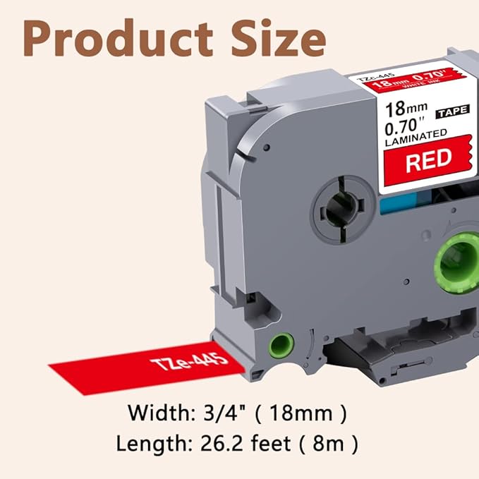 - Product features : Split back, water resistant, fading resistant, abrasion resistant, temperature resistant, strong adhesive. This compatibel label tape 18mm TZe-445 White on Red is suitable for indoor and outdoor use
