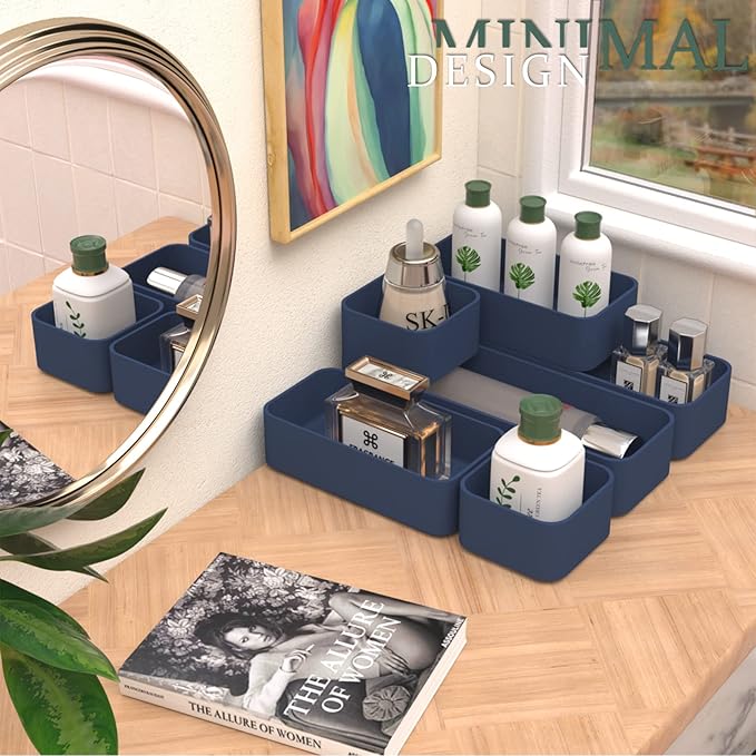 CHANCETSUI 6 PCS Stackable Drawer Organizers Set, Versatile Desk and Vanity Drawer Organizer Trays, Storage Bins for Makeup, Bathroom, Bedroom, Kitchen and Office, Blue