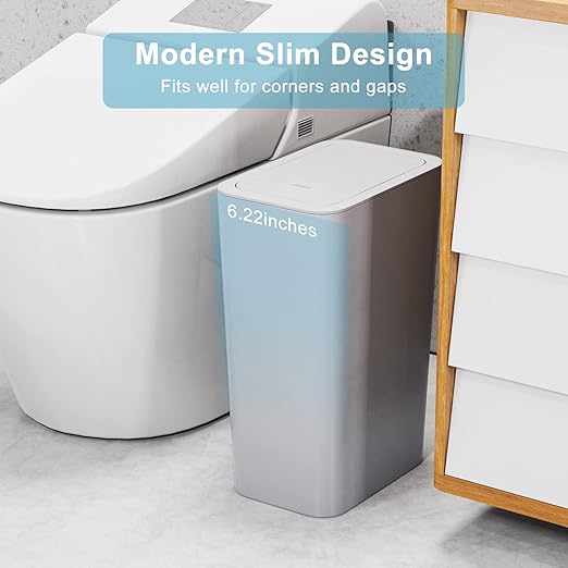 - Fits Almost Everywhere: A stylish small garbage can with a modern slim design that looks great and easily fits into narrow openings and small spaces. Small trash can fits well in bathrooms, Kitchen, offices or wherever space is limited