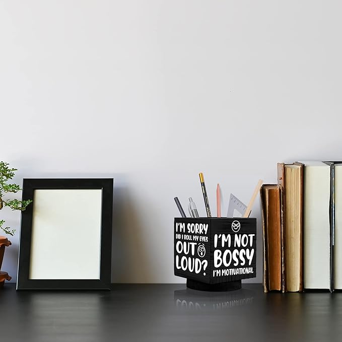 Outus Wooden Spinning Pen Holder for Desk I'll Remember It Later Pencil Holder Cute Organizer Funny Desk Decor Pencil Case Art Supply Storage Box for Home Office (Black)