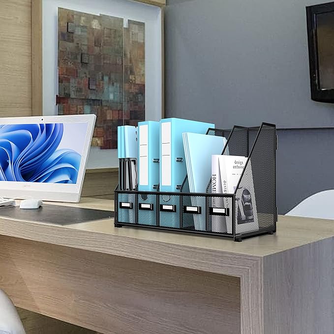 - [Humanized Detail Design] The file holder for desk has 5 vertical compartments, which is convenient for classifying office supplies. Replaceable tags are a great help for labeling, classifying, and quickly finding the desired item. Anti-skidding foot make the binder organizer difficult to slide on the desktop.