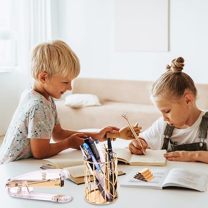 - 【Robust & Durable】Our stapler, long tail clip, scissors, ruler, pen, staples made of high-end acrylic and gold-plated metal material, transparent and shiny like glass, naturally elegant and beautiful, sturdy and durable.These rose gold desk accessories are perfect for home, school, and office decor and use.