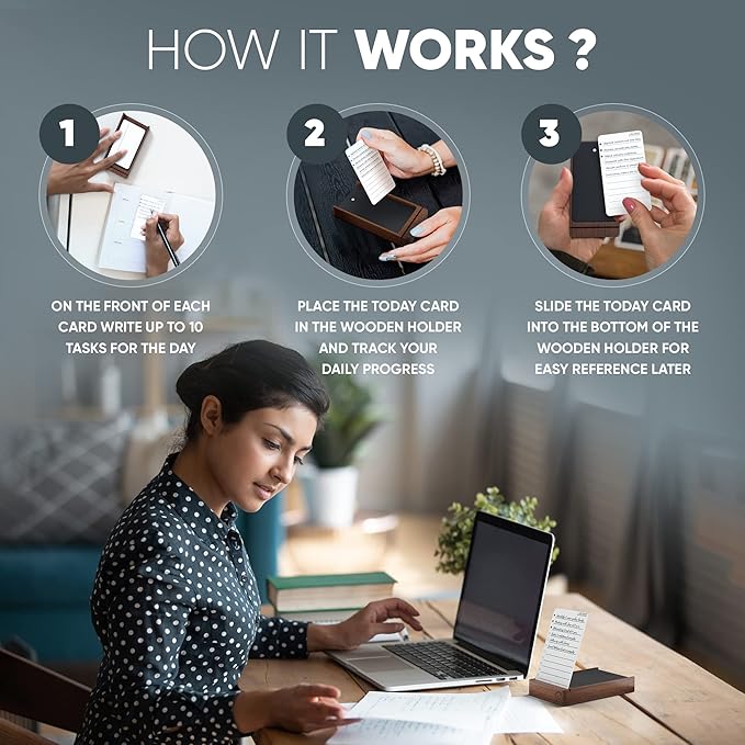 Undated Daily Planner To Do List Notepads and Walnut Stand - 120 Checklist Cards, 10 Goal Cards - Perfect Note Pads for Work Desk or School - ADHD Office Accessories - Productivity Task Analog