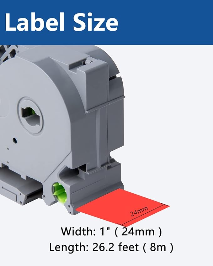 - Size - 0.94" width x 26.2' length ( 24mm x 8m ) each 24mm label maker tape. Color - Black ink on red tape