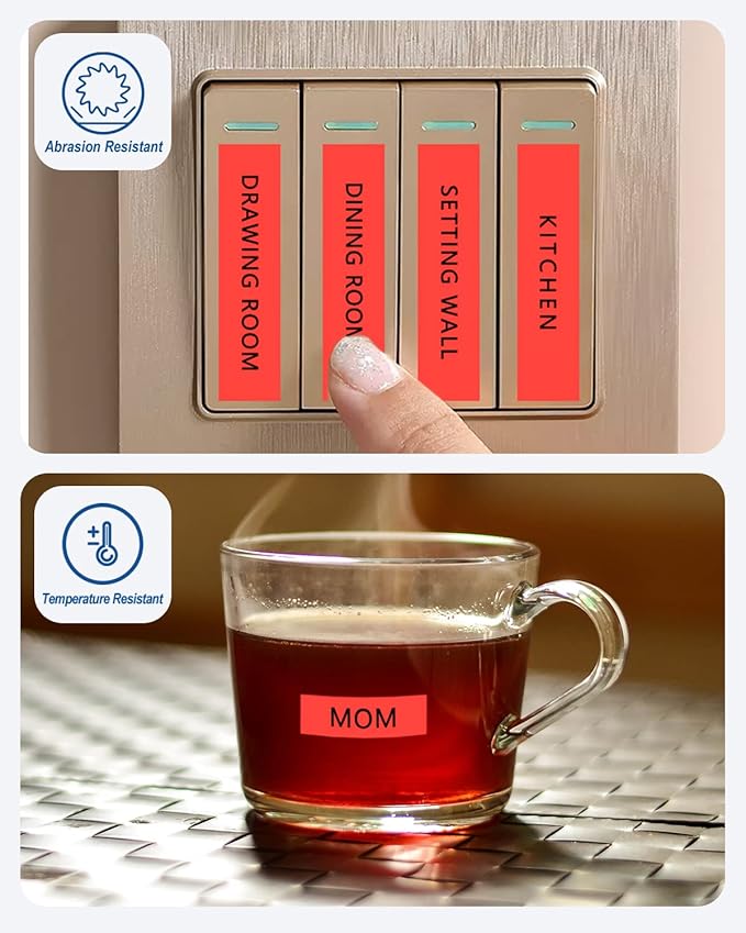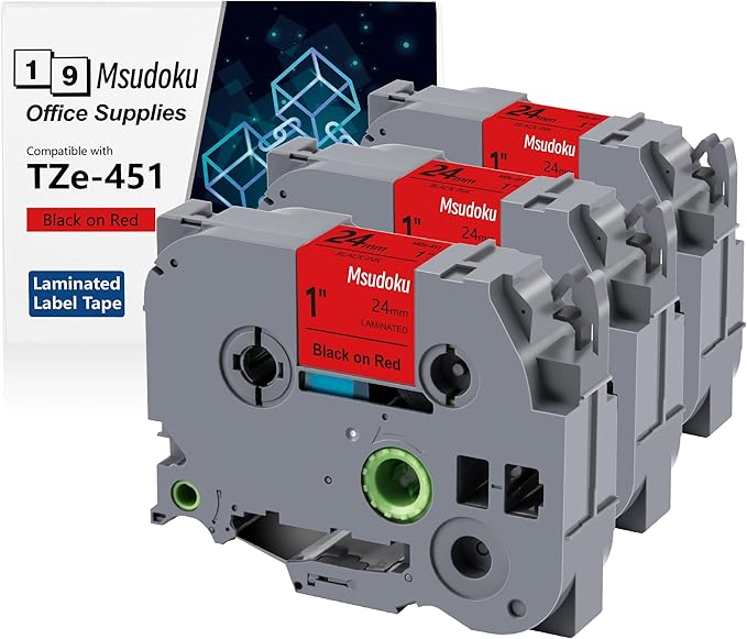 - These compatible for brother label maker tape 24mm 0.94 TZe-451 TZe451 have strong adhesive and no sticky residue when you remove it. The split back design of ptouch label tape 24mm red tape is very easy to peel off