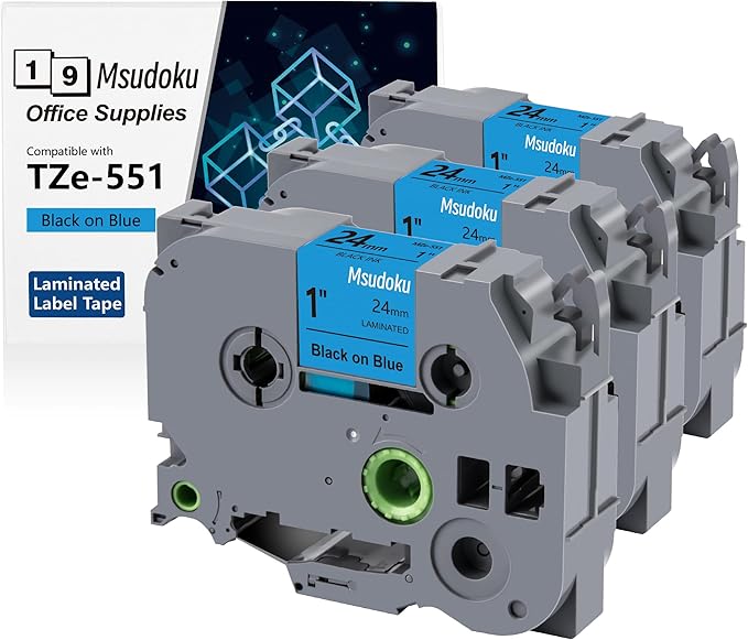 - These compatible for brother label maker tape 24mm 0.94 TZe-551 TZe551 have strong adhesive and no sticky residue when you remove it. The split back design of ptouch label tape 24mm blue tape is very easy to peel off
