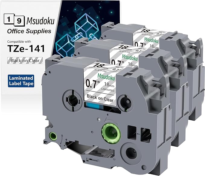 - These compatible for brother label maker tape 18mm 0.7 TZe-141 TZe141 have strong adhesive and no sticky residue when you remove it. The split back design of ptouch label tape 18mm clear tape is very easy to peel off