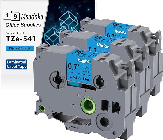 - These compatible for brother label maker tape 18mm 0.7 TZe-541 TZe541 have strong adhesive and no sticky residue when you remove it. The split back design of ptouch label tape 18mm blue tape is very easy to peel off