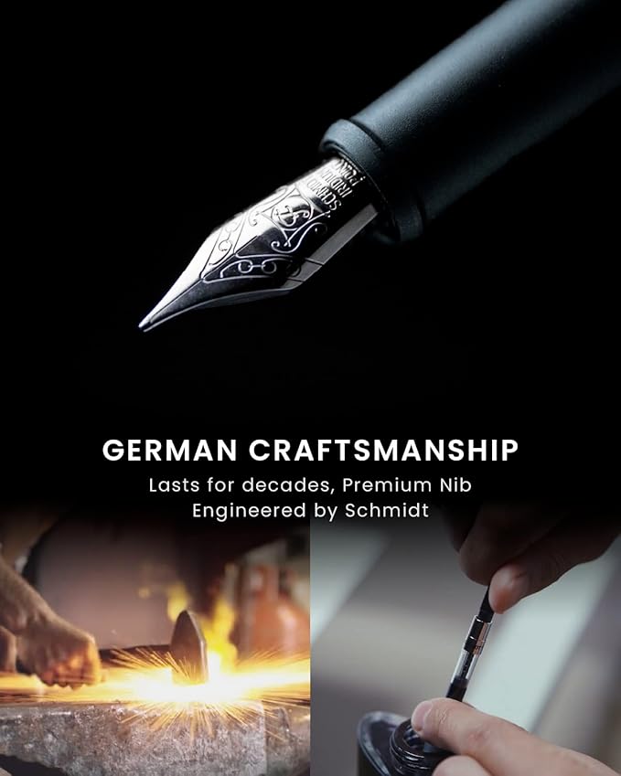 - β Addictivve & Silky Writing Experience: Your creativity needs to flow uninterrupted. This 2-In-1 Set comes with extra rollerball pen grip. Schmidt rollerball cartridge, and stainless steel fountain pen nib from Schmidt, the Germany company with over a century of experience in craftmanship excellence. Thanks to their exquisite inflow design, pure, unbroken lines of thought jump forth from the pen to paper without spills, spotting, or explosions.