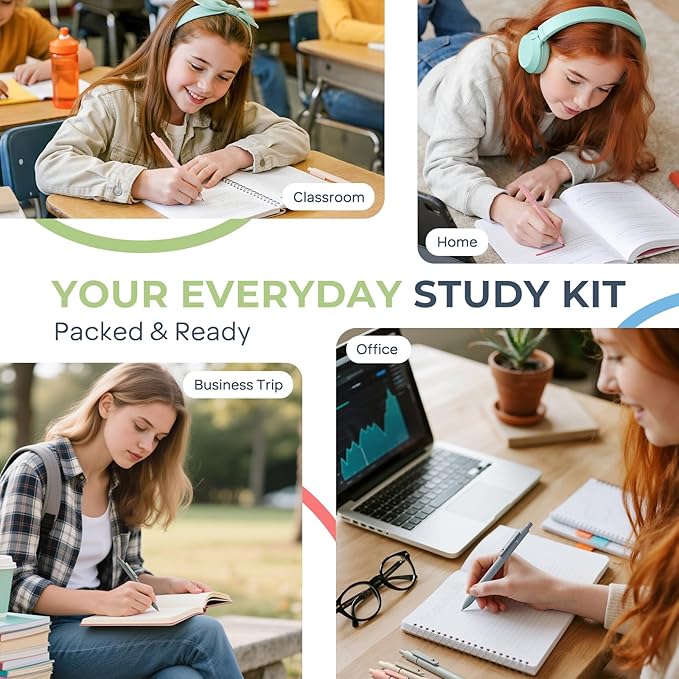 - All-in-One 39PCS Stationery Kit - Covers Every Writing & Highlighting Need:This comprehensive set includes 12 pastel highlighters assorted colors (with eye-friendly, vibrant yet soft hues), 6 cute mechanical pencils (mix of 0.5mm, 0.7mm, and 0.9mm tips to fit precise writing, sketching, and drafting), 5 black ink gel pens + 5 extra gel pen refills, 3 erasers + 9 cap eraser refills, 6 tubes of HB lead refills, and a cute pink pencil pouch. It’s a one-stop solution for students (middle school to college) girls, office workers, and journaling enthusiasts
