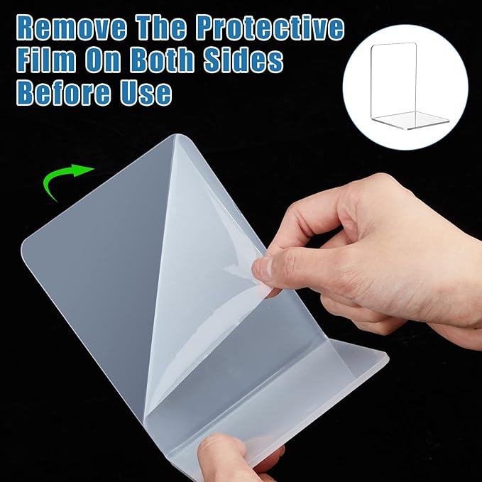 - Protective Film Design: each of the clear book holders has a layer of frosted film to guard the books from being scratched; Please remember to tear off the protective films before use