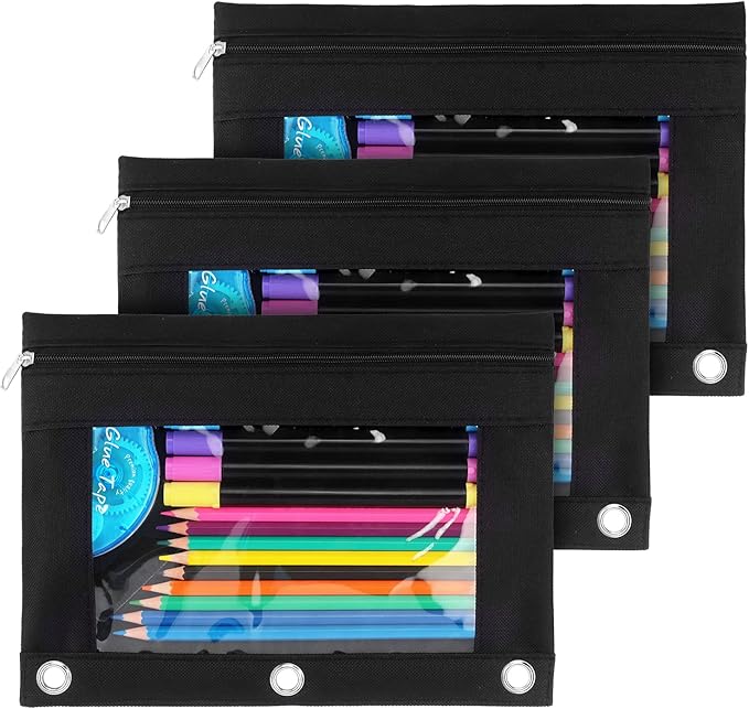 Tamaki 3 Ring Binder Pencil Pouch, Clear Window Pencil Case, Black, 3 Pack