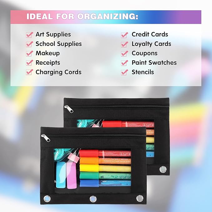 - Pencil Pouch 3 Ring: There's plenty of room for storing pens, pencils, markers, etc. Suitable well in standard 3-ring binders.