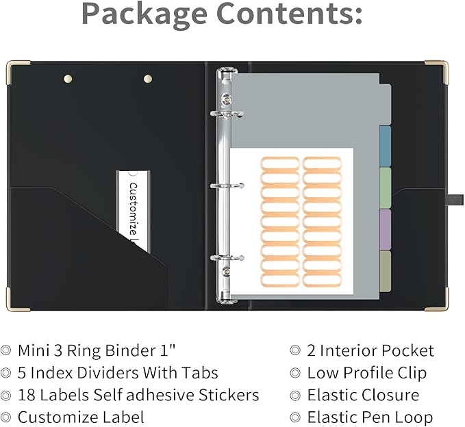 - 【Small Binder with Dividers】Mini Binder comes with 5 index dividers with tabs and 18 custom label stickers for easy viewing. Features two interior pocket to store letter size papers and important loose documents.
