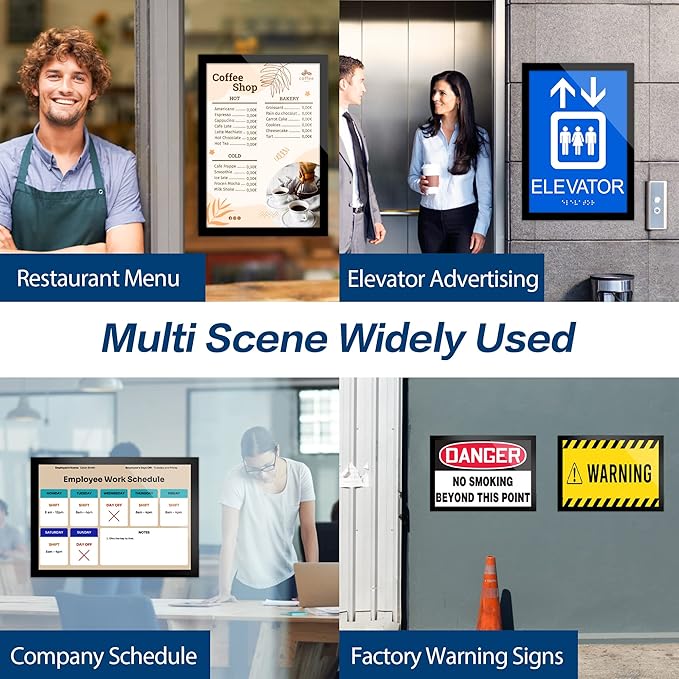 - ✔【Flexible Application in Various Scenarios】Acrylic magnetic sign holder can be displayed vertically or horizontally and reused. It is an excellent advertising tool for offices, factories, homes, shops, restaurants, hotels, banks, exhibitions, schools, hospitals, corridors, elevator entrances and other places to display certificates, document notices, flow charts, reminder signs, drawings, photos, price lists, business hours, precautions, posters.