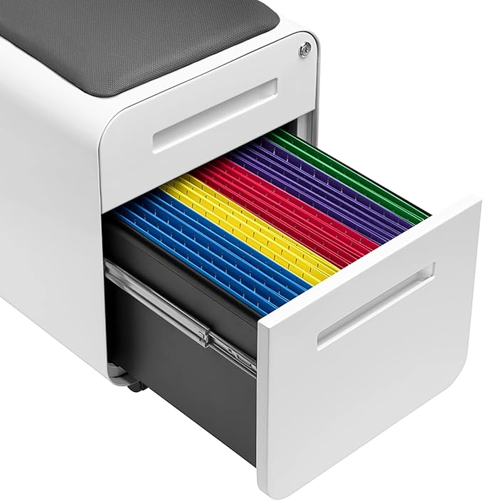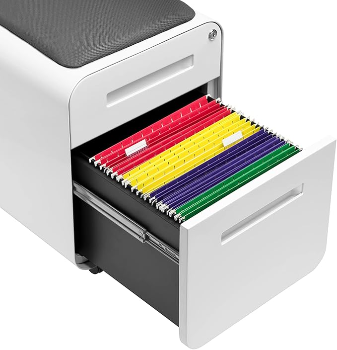 Laura Davidson Furniture STOCKPILE Mini Seated 2 Drawer Mobile File Cabinet with Removable Magnetic Cushion Seat - Short Version, Metal Filing Cabinet, Pre-Assembled, White with Grey Cushion