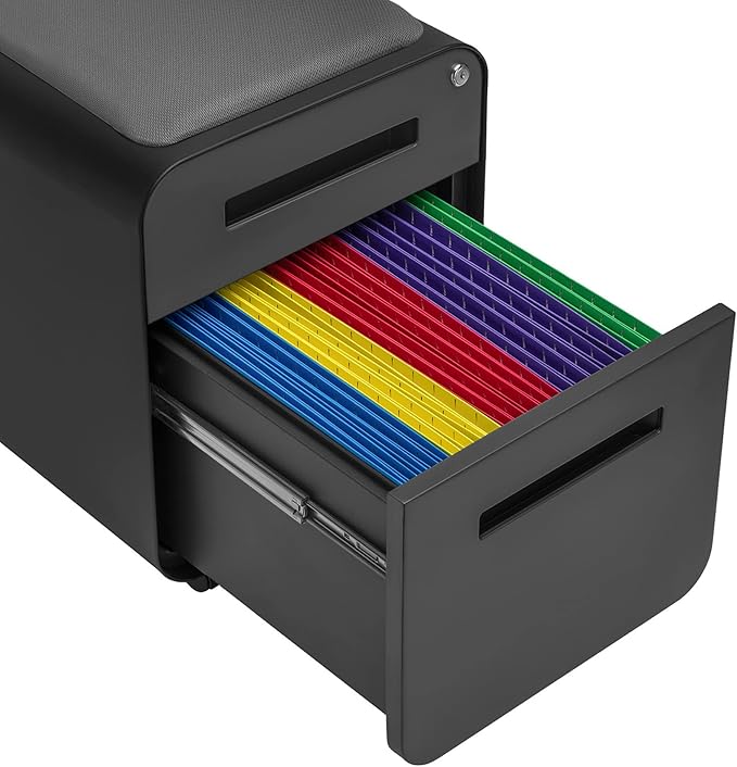 Laura Davidson Furniture STOCKPILE Mini Seated 2 Drawer Mobile File Cabinet with Removable Magnetic Cushion Seat - Short Version, Metal Filing Cabinet, Pre-Assembled, Black with Grey Cushion