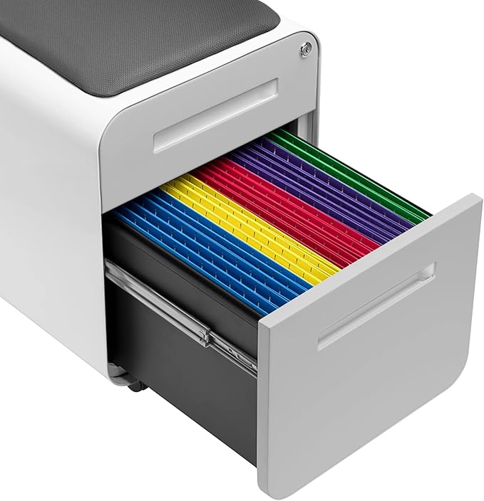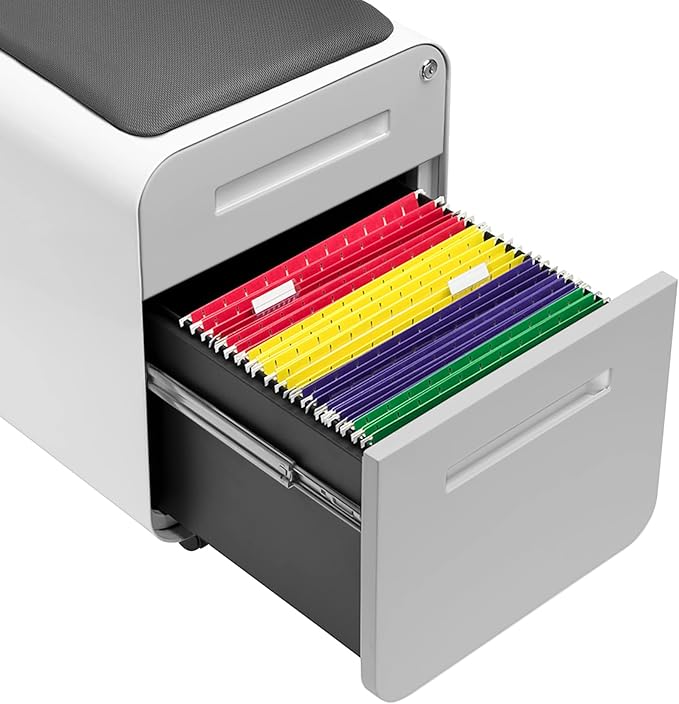 Laura Davidson Furniture STOCKPILE Mini Seated 2 Drawer Mobile File Cabinet with Removable Magnetic Cushion Seat - Short Version, Metal Filing Cabinet, Pre-Assembled, Light Grey Face with Grey Cushion