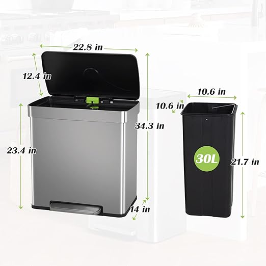 - 【Super Capacity】Our foot pedal trash can perfectly avoids the disadvantages of traditional trash cans, which are bulky . Our foot pedal trash can uses silent slow drop technology to open and close the lids, ensuring that your garbage is acoustically sanitary.