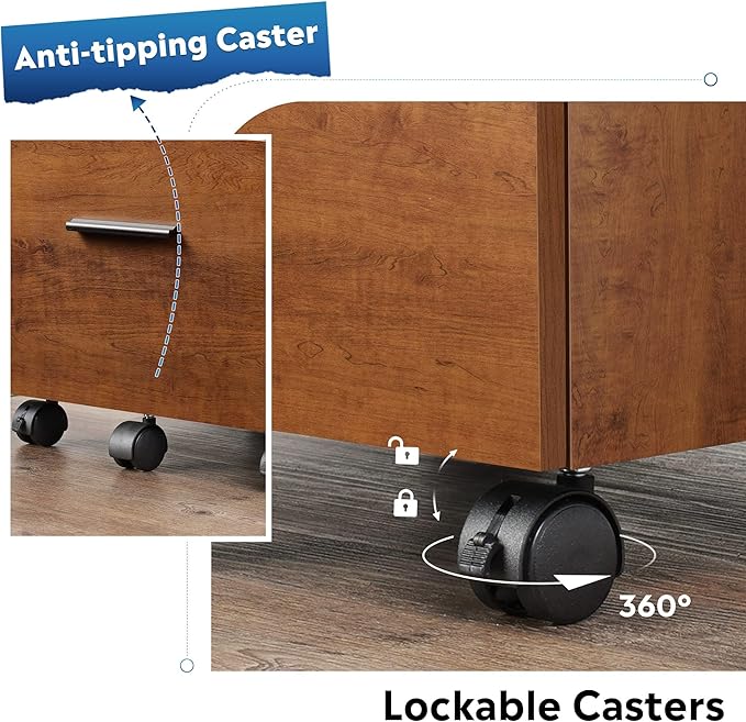 - 【Easy to Move】 Equipped with five 360° swivel wheels, including 2 front lockable wheels and 1 anti-tip wheel for stability. Move your filing cabinets anywhere you like without worrying about it tipping over.