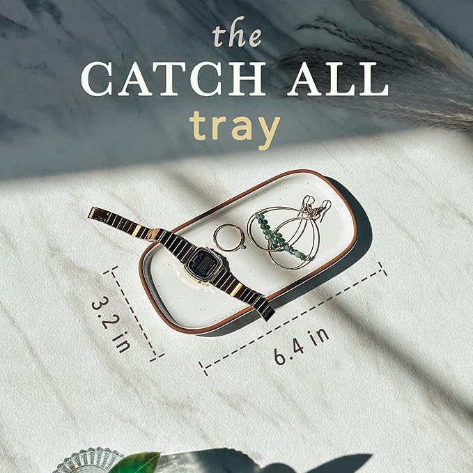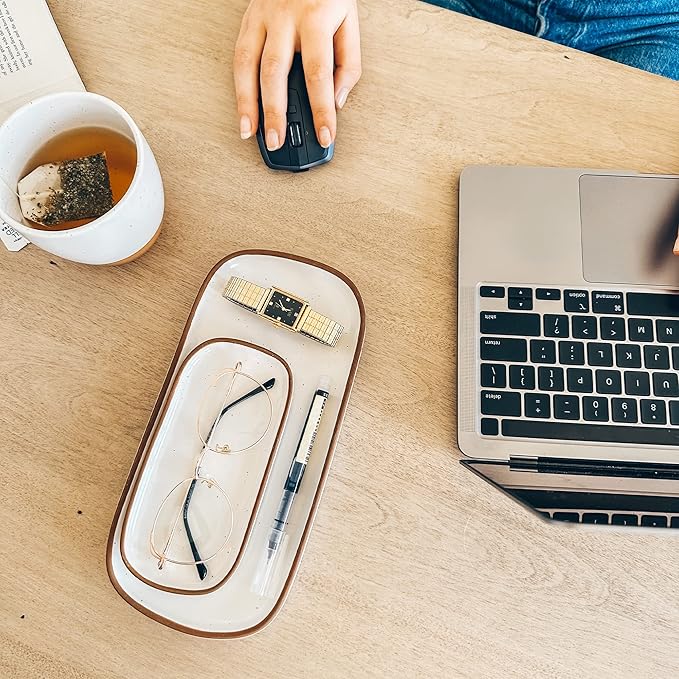 - VERSATILE USES: We all love a multi-functional object. Trays are all the rage right now and with good reason. Storing things on a tray gives a minimal and organized aesthetic and can be used for an endless amount of things. Your stationary, soap dispensers, brushes, candles, cosmetics, jewelry etc all deserve a beautiful home. The glaze is also food grade and work great for serving cheese, sushi, mini cakes, etc.