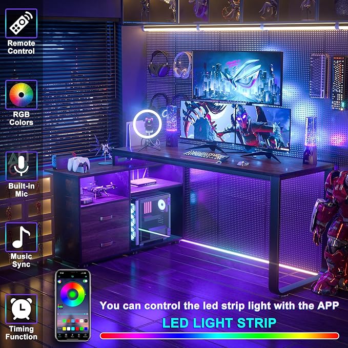 - Computer Desk with Socket & Smart LED Lights: Built-in power charge station (3 regular outlets and 2 USB ports included), which allows keeping your laptop, tablet, printer or other everyday devices nearby while charged. You can also control the LED lights with the App, and customize any color you like. Meanwhile, it has a variety of modes like music sync, timer functions, etc, providing a great ambiance for whatever mood you are in.