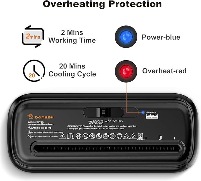 - Overheating Protection: Upgraded overheat warning protection auto start, when the red light is on, the shredder stops working and then needs a 20-minute cool-down, makes shredding machine be more safe while using it.