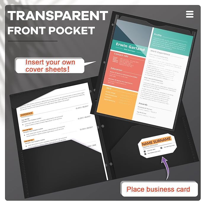 - Easy Organization: each plastic pocket folder features with 3 holes in one side, which enables you to put it into a standard 3 ring binder to organize loose documents, and clear front pocket of each folder help to store other items, giving you a comfortable using experience