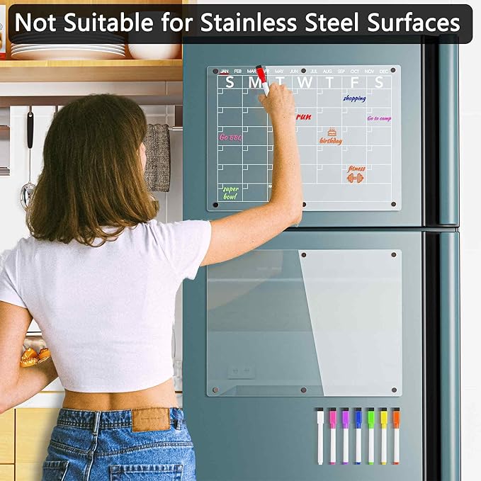 - Easy To Wipe & Reusable: The clear acrylic fridge calendar has a stain-resistant surface; You can erase countless times without any smudgy ghosting or staining; Use the marker cap to wipe or just use a wet towel to wipe.