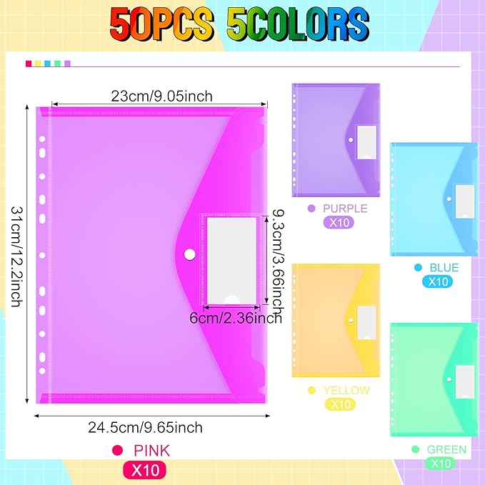Fuutreo 50 Pcs Binder Pockets for 3 Ring Plastic Envelopes Pocket Folders 11 Hole Snap Button Binder Pouch with Label Expandable Organizer for 2/3/4 Ring
