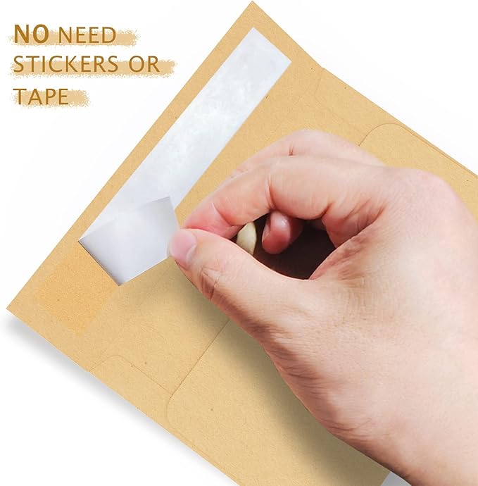 - Envelopes Self Seal: Our A7 envelopes feature a self-sealing flap for easy closure and extra security; This means that you don't have to worry about having to manually seal the envelope, saving you time and energy; The 5 x 7 envelopes are also made of sturdy and durable kraft paper, allowing you to use them over and over again without worrying about them tearing or breaking