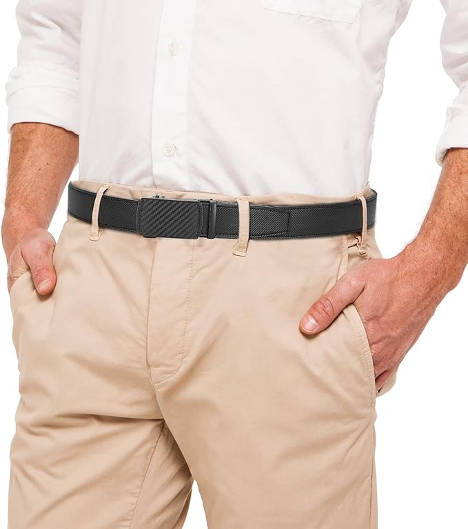 - Effortless to Use: Experience the ultimate convenience with our black leather belt. Simply slide it into the sliding buckle, pull it through, and the click-it buckle automatically locks in place. Releasing the belt is just as easy - gently push the lever on the side of the automatic buckle, and the lock snaps shut. Enjoy the seamless simplicity and smoothness of our ratchet belt design.