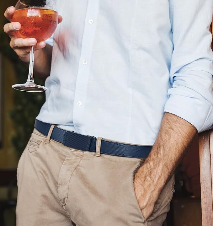 • Effortless to Use: Experience the ultimate convenience with our blue leather belt. Simply slide it into the sliding buckle, pull it through, and the click-it buckle automatically locks in place. Releasing the belt is just as easy - gently push the lever on the side of the automatic buckle, and the lock snaps shut. Enjoy the seamless simplicity and smoothness of our ratchet belt design.