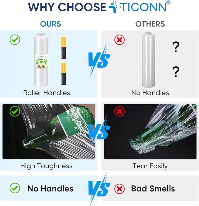 - [PREMIUM QUALITY] Our stretch film inherited the superior quality of other TICONN moving supplies. The plastic wrap is made from thick no odor industrial strength material