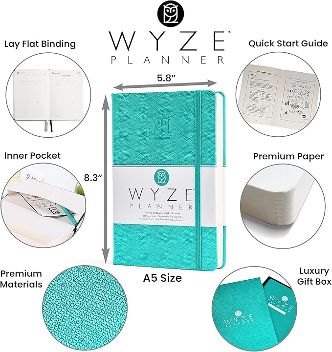 Undated Daily Planner – 6-Month A5 Productivity Organizer with Full Page Per Day, Hourly Schedule, Goal Setting, Habit Tracker, Weekly & Monthly Pages – Hardcover Time Management Notebook (Turquoise)