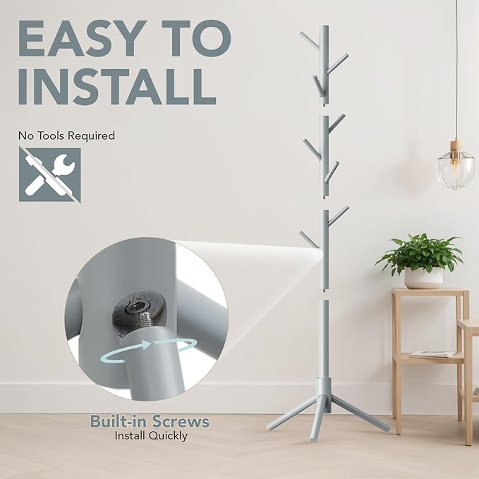 - Easy Installation: Each connection is equipped with metal screw holes with screw-in design. Turn and tighten the base of the coat rack, the four sections of the center pole and the eight hooks in order. No additional tools are required, saving tedious steps, five minutes to complete assembly for immediate use