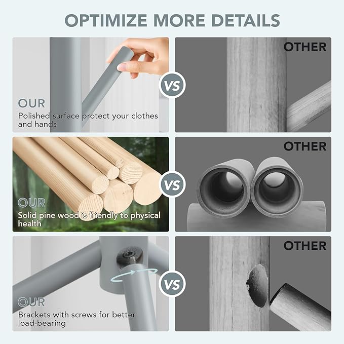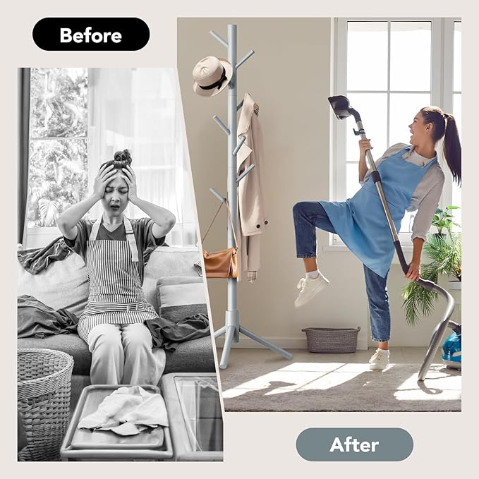 - Unique Craftsmanship: Hupmad freestanding coat rack is made of New Zealand pine wood, which is strong. The columns and hooks have a fine polished surface with a smooth and rounded feel. Protect your clothes from being scratched. The solid wood coat rack retains the natural wood grain and provides a simple and elegant versatile style