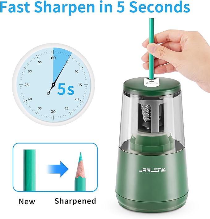 JARLINK Electric Pencil Sharpener, Heavy-Duty Helical Blade to Fast Sharpen, Auto Stop for No.2/Colored Pencils(6-8mm), AC Adapter/Battery Operated in School Classroom/Office/Home (Green)