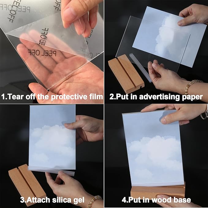 - Easy to Install: Just peel off the protective film of the acrylic sign, put the paper between the acrylic panels, install the silicone strip at the bottom and insert it into the slot on the wood base.