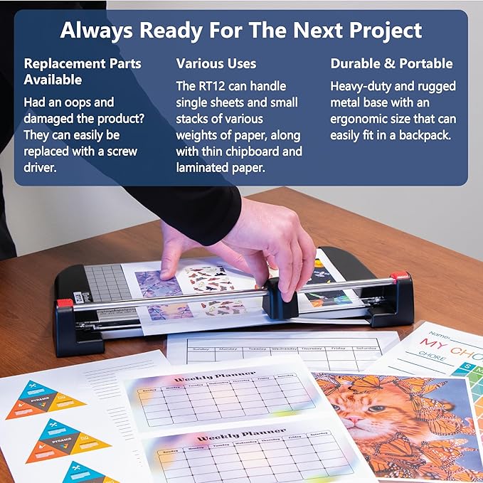 - PRECISE: The self-sharpening rotary cutter blade smoothly cuts in both directions, delivering consistently clean and precise edges. Perfect for trimming photos, cardstock, flyers and more, this paper cutter ensures flawless results every time.