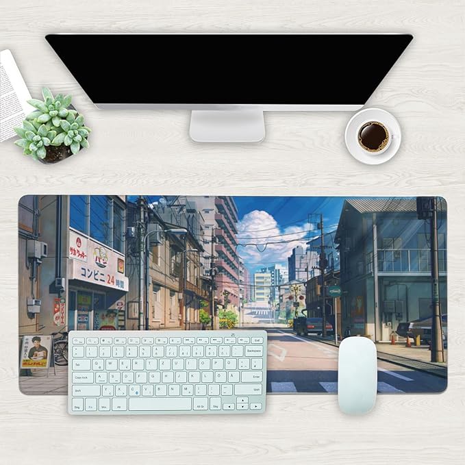 Desk Mat, Anime Summer Street Scenery Extended Gaming Mouse Pad Large, 35.4"x15.7" Big Mouse Pad with Non-Slip Base and Stitched Edge, Long Computer Keyboard Mouse Mat for Home Office Work